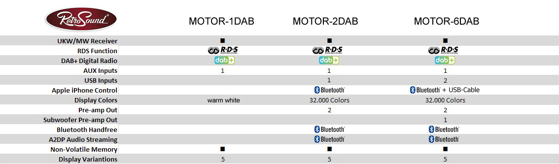 Das „Model MOTOR-6DAB“ ist ein Premium-Modell von RetroSound. Es ist optisch baugleich mit dem günstigeren Modell „MOTOR-2DAB“ und hat zusätzlich zu deren Ausstattung einen zweiten USB-Eingang auf der Geräterückseite, APPLE iPhone Schnittstelle üer USB, Bluetooth Audio und Freisprech-Funktionen, drei Vorverstärkerausgänge und ein Multicolorbeleuchtung.